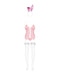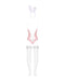 Kostüm-Set Bunny von Obsessive in Rosé und Weiß. Bestehend aus Strapshemd und Netzstrümpfen, Hasenohren-Haarreif sowie Slip mit Puschelschwänzchen hinten. Elastisches weiches Strapshemd mit offener Schleifen-Front und verstellbarer Schnürung im freien Rücken. Die Strumpfhalter sind mit kleinen Schleifen verziert.