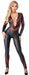 Rundum elastischer Overall von Cottelli PARTY im schwarzen Mattlook mit roten betonenden Kontrast-Streifen. In hautnaher Schnittführung mit langem Arm und langem engen Bein. Vorne tief bis zum Bauch ausgeschnitten, eine silberfarbene Kette hält alles schön zusammen. Im Rücken 3-Wege-Reißverschluss vom Nacken durch den Schritt bis nach vorn.