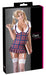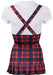 Dieses Kleid ist die perfekte Schuluniform. Obenrum in Form einer weißen Bluse mit kurzen Ärmeln, Kragen und tiefem Ausschnitt sowie mit angenähtem, blau-rot-kariertem Rockteil, dessen angenähte Träger über den Busen reichen und sich im Rücken überkreuzen. Mit kurzem Faltenrock und zwei weißen Strapshaltern vorn.