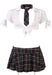 Strenge Krawatte und wippender Mini seitlich mit Reißverschluss, kurzes Top vorne und an den Armen zum Binden, sowie Slip ouvert mit sexy Po-Ausblick.