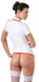 Weißes Strapshemd mit roten Paspelierungen, tiefem Dekolleté, kurzen Armen, Kragen und zwei Strapshaltern.