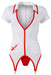 Weißes Strapshemd mit roten Paspelierungen, tiefem Dekolleté, kurzen Armen, Kragen und zwei Strapshaltern.
