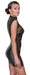 Tailliertes kurzes Kleid von Cottelli PARTY im schwarzen Mattlook mit transparenten Powernet-Einsätzen in der Front. Stehkragen mit 2 Knöpfen im Nacken, darunter großer ovaler Ausschnitt im Rücken. Weich und hochelastisch für hohen Tragekomfort.