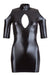 Dieses schwarze Minikleid mit Stehkragen und kurzem Arm besticht mit freien Schultern sowie raffiniertem Ausschnitt am Dekolleté. Das matt glänzende Wetlook-Material liegt dabei eng an und bringt weibliche Kurven formschön und verführerisch zur Geltung.