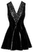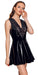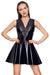 Kurzes, ärmelloses Kleid von Black Level komplett im schwarzen Lackglanz mit breitem v-förmigen Spitzen-Einsatz im tiefem Dekolleté. In figurnaher Schnittführung mit ausgestelltem Röckchen. Hinten mit eingearbeitetem Reißverschluss.