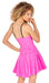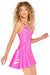 Kurzes Kleid von Black Level komplett im pinkfarbenen Lackglanz. Vorne mit durchgehendem, unterlegtem silberfarbenem Reißverschluss. In figurnaher taillierter Schnittführung mit ausgestelltem asymmetrischem Röckchen, das vorne kürzer als hinten geschnitten ist. Ausgearbeitete Cups für ein tiefes schönes Dekolleté. Die schwarzen Träger sind passend verstellbar.