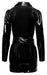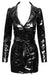 Extra kurzes Kleid von Black Level komplett im schwarzen Lackglanz. Figurnah und tailliert geschnitten im Mantel-Styling mit langem Arm, stilechtem Reverskragen, durchgehender Duckknopfleiste vorne und Bindegürtel.