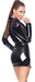 Extra kurzes Kleid von Black Level komplett im schwarzen Lackglanz. Figurnah und tailliert geschnitten im Mantel-Styling mit langem Arm, stilechtem Reverskragen, durchgehender Duckknopfleiste vorne und Bindegürtel.