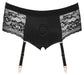 Schwarze Strap-on-Panties von Bad Kitty im weichen elastischen Material-Mix aus Mikrofaser und Spitze. Vorne doppellagig mit Einschub gearbeitet und mit sorgfältig eingearbeitetem Stretch-Haltering (Ø 3,5 cm) zum Einsetzen eines Dildo/Vibrators mit Stand-/Saugfuß. Über dem Po mit einladendem Cut-out. Die Strumpfhalter sind verstell- und auch komplett abnehmbar.