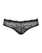 Der schwarze Slip Frivolla von Obsessive ist ein zarter Spitzentraum, der die weibliche Silhouette weich und elastisch umspielt. Als Überraschung präsentiert sich die Rückseite in Riemchen-Optik über dem nackten Po, gekrönt von einem kleinen Satinschleifchen.