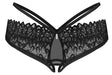Verführerisch geschnittener Slip ouvert Donarella von Obsessive in schwarzer Transparenz mit aufwendiger Stickerei. Stylisches Stretchband-Bund mit kleinem Schmuckelement vorne. Rundum weich und elastisch für vollen Komfort. Im Schritt verführerisch offen.