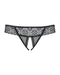 Raffiniert geschnittener String ouvert Shibu von Obsessive aus schwarzer feiner Spitze. Weich und elastisch für hohen Tragekomfort. Vorne am Bund mit kleinem Schmuckelement, hinten kleine Aussparung über dem Po. Im Schritt einladend offen.