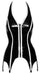 Aufsehenerregendes Strapshemd von Black Level im schwarzen Lackglanz mit weißen Lack-Paspelierungen und -Streifen. Vorne mit praktischem, durchgehendem Reißverschluss. Rückenfrei - Neckholder mit Klettverschluss. Die 4 Metall-Strumpfhalter (Clips) sind fest am Strapshemd angenäht.