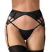 Schwarz-transparenter Strapsgürtel Donarella von Obsessive mit aufwendigen Stickerei-Einsätzen seitlich. Weich und elastisch für hohen Tragkomfort. Je 4 Stretchbänder vereinen sich jeweils seitlich zu einem verstellbaren Strumpfhalter. Im Rücken mit Hakenverschluss. Vorne am Bund mit kleinem Schmuckelement.