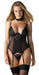 Schwarzes 3-teiliges Set Donarella von Obsessive mit Straps-Corsage, String und Halsband. Aus feinem Stretchtüll mit aufwendigen Stickerei-Einsätzen. Rundum weich und elastisch für hohen Tragekomfort. Straps-Corsage mit kleinem Schmuckelement zwischen den bestickten Bügel-Cups. Im Rücken mit Schnürung. Die Träger und die Strumpfhalter sind passend verstellbar. Der schöne Stickerei-String verführt mit stylischen Stretchbändern. Das verstellbare, eng anliegende Halsband komplettiert den erotisch eleganten Look!