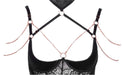 Aufsehenerregendes Strapshemd von Abierta Fina aus elastischem Satin, vorne mit silhouetteführenden Spitzeneinsätzen und garniert mit roségoldfarbenen Schmuckelementen. Die eingearbeitete Bügel-Hebe mit leicht gepolsterten Cups bringt den Busen in Hochform und direkt ins Blickfeld. Raffiniert sind die beiden verstellbaren Dekolleté-Riemen, die von den verstellbaren Trägern zu dem Halsband mit Klettverschluss führen. Die schmückenden mit Strassteinen besetzten Ketten über der Brust und den Schultern sind mit kleinen Karabinerhaken versehen und somit abnehmbar. Im Rücken mit Hakenverschluss. Die Strumpfhalter sind in der Länge verstellbar. Der kleine String ouvert aus Stretch-Satin mit der abnehmbaren Kette im offenen Schritt ist inklusive.
