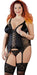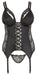 Figurformendes Strapshemd mit verstellbaren Strumpfhaltern. Auf der Vorderseite mit verstärktem Stretchsatin, Blütenspitze und einer durchgehenden Schnürung. Im Rücken aus Powernet mit einem langen Hakenverschluss. Brustteil mit 2 breiten Trägern und Soft-Cups, die komplett abknöpfbar sind, so dass die offene Brust lediglich von 2 Spitzenbändern eingerahmt wird. Inklusive passendem String.