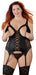 Figurformendes Strapshemd mit verstellbaren Strumpfhaltern. Auf der Vorderseite mit verstärktem Stretchsatin, Blütenspitze und einer durchgehenden Schnürung. Im Rücken aus Powernet mit einem langen Hakenverschluss. Brustteil mit 2 breiten Trägern und Soft-Cups, die komplett abknöpfbar sind, so dass die offene Brust lediglich von 2 Spitzenbändern eingerahmt wird. Inklusive passendem String.