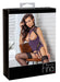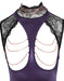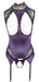 Busen- und rückenfreies Strapshemd von Abierta Fina aus elastischem violettfarbenem Satin mit feinen schwarzen Spitzeneinsätzen und Spitzen-Halsband mit 2-fachem Knopfverschluss. Halsband vorne mit 3 Ketten verziert. Auch der freie Busen und der freie Rücken sind mit roségoldfarbenen Ketten verziert, die alle dank kleiner Karabinerhaken abnehmbar sind. Hinten ist das Strapshemd mit einem Hakenverschluss versehen. Die Strumpfhalter sind in der Länge verstellbar. Der dazu passende String ist im einladend offenen Schritt mit einer stimulierenden Schrittkette ausgestattet, die ebenfalls abnehmbar ist.