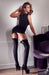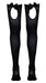 Schwarze Halterlos-Strümpfe mit Schleifen- und Strassverzierung an der Aussparung. Mit silikonverstärktem Abschluss.