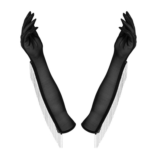 Das gewisse Extra!Schwarze lange Handschuhe Milladis von Obsessive aus feinem Stretchtüll mit schwingenden Kettchen-Fransen. Weich und elastisch fü...