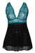 Kurzes Babydoll von Cottelli CURVES in Zweiteiler-Optik mit eng geschnittenem Oberteil aus feiner petrolfarbener Spitze und ausgestelltem Rockteil aus schwarzem doppellagigem Powernet. Verführerisch tief dekolletiert. Raffinierte Träger-Lösung: Die Spitzenträger gehen in 4 schwarze Stretchträger über, die im Rücken mit einem Ring an einem zarten Spitzendreieck verbunden sind. Die Träger sind für perfekte Passform in der Länge verstellbar.