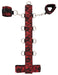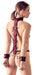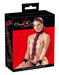 Halsfessel mit beringtem Steg und Handfessel-Set mit Karabinerhaken. Aus sinnlich rotem Satin und schwarzer Spitze. Auf der Innenseite aus edlem schwarzem Samt. Mit individuell einstellbaren Klettverschlüssen.