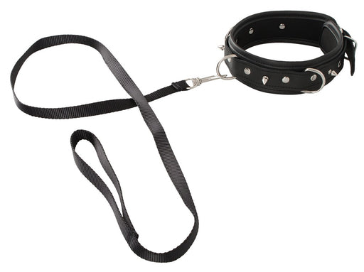 Vegan FetishAuf LagerHalsfessel und Leine im Set!Die Halsfessel in Leder-Optik ist weich gepolstert und besticht mit dekorativen Spikes und D-Ringen. Die Webriemen-Lein...