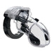 Peniskäfig aus festem Silikon mit Schelle, Fixierscheibe, drei Abstandshaltern, Metallschloss mit zwei Schlüsseln, Elektrodenkabel, fünf Kunststoffsiegeln und zehn Besitzschildern. Gesamtlänge 8,2 bis 9,4 cm. Ø 3,4 bis 4,7 cm. Material: Silikon, PC, ABS. Hinweis: Zubehör für die Reizstromgeräte Tension Lover (0528927 0000) und Pure Vibes (0529761 0000).