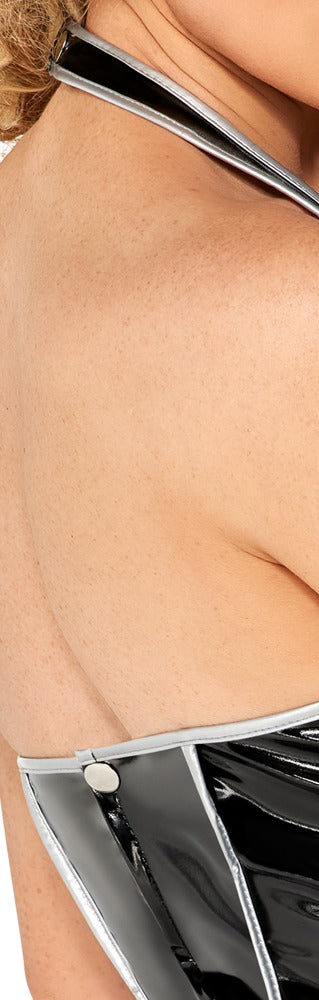 Unbeschreiblich weiblich!Kurzes Neckholder-Kleid von Black Level im schwarzen Lackglanz mit silberfarbenen Ziernähten in taillenbetonender Korsett-...