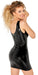 Kurzes ärmelloses Kleid von Black Level komplett im schwarzen Lackglanz mit silberfarbenen Schnallen. In enger taillierter Schnittführung mit offener Front, die von den 3 breiten Schnallenriemen effektvoll zusammengehalten wird. Die Riemen sind passend verstellbar. Im Rücken tiefer runder Ausschnitt, darunter Druckknopf- und Reißverschluss.
