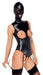 Extravaganter schwarzer Straps-Body ouvert von Bad Kitty mit angenähter Kopfmaske. Aus stilvollem Lederimitat – weich und elastisch für hohen Tragekomfort. Hinten mit sorgfältig eingearbeitetem Reißverschluss. Aufregend busenfrei und im Schritt einladend offen. Kopfmaske mit Öffnungen für Augen und Mund. Die verstellbaren Strumpfhalter sind abnehmbar.