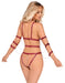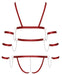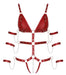 Extravaganter Body ouvert von Bad Kitty in Bondage-Optik aus weichen elastischen Riemen im edlen dunkelroten Mattlook. Mit Cups zum Öffnen (Druckknöpfe) und abnehmbarer Karabinerkette im offenem Schritt. Träger und Riemen mit Druckknöpfen passend verstellbar. 6 Fesselriemen für Hände/Arme mit Karabinerketten – von den Ringen seitlich am Body abnehmbar. Schmale Fesselriemen mit verstellbaren Klettverschlüssen.