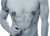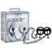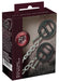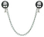 2 schwarze, runde Nippel-Schraubzwingen, verbunden mit federleichter Metallkette. Druckstärke der Zwingen individuell justierbar.