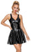 Schlicht-schönes tailliertes Minikleid von LateX aus schwarzem Latex (Stärke 0,35 mm). Obenrum im hautnahen Top-Styling mit schmalen Trägern, untenrum ein weit schwingendes Röckchen.