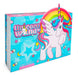 Massagestab Unicorn Wand inklusive Einhorn-Dildoaufsatz und Aufbewahrungs-/Reisebeutel sowie Postkarte, Schlüsselanhänger, Aufnäher und Aufkleber mit Regenbogen- und Einhorn-Motiven. Ebenfalls inklusive: Netzstecker-Ladekabel mit 4 verschiedenen Steckdosenadaptern, sodass der Massagestab weltweit (z. B. auf Reisen) verwendet werden kann.