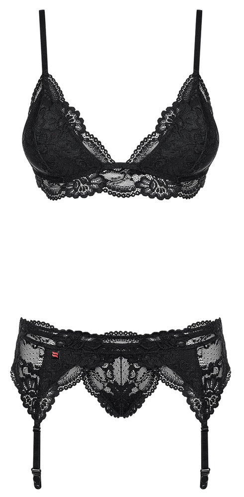ObsessiveAuf LagerFeminine Versuchung!BH, Strapsgürtel und String im 3-teiligen Verführ-Set aus edler schwarzer Spitze. Träger und Strapse verstellbar.90% Polyamid, ...