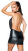 Eng geschnittenes Minikleid im matt glänzenden Powerwetlook mit swingendem transparentem Powernet-Oberteil. Der Frontsteg ist mit Glitzersteinen verziert und mündet an einem Halsband mit Hakenverschluss. Hinten bietet das Kleid eine herrlich nackte Rückenansicht, nur der Po ist vom Rock bedeckt.