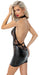 Kurzes Kleid von Noir im matt glänzenden Powerwetlook mit raffinierten Spitzeneinsätzen jeweils seitlich und hinten. In aufregend enger Schnittführung mit großzügigem Dekolleté bis zum Bauchnabel, der Rücken bleibt nahezu komplett frei. Halsband-Neckholder und Taillenband mit Verschluss im Nacken bzw. Rücken.