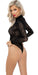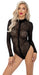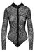 Langarm-Body von Noir komplett aus weichem elastischem Powernet mit feinem Samtflockprint im Leoparden-Look. Der praktisch-erotische 3-Wege-Reißverschluss verläuft vorne vom Stehkragen bis tief runter in den Schritt. Hohe Beinausschnitte setzen Po und Beine aufregend in Szene.