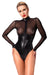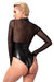 Schwarzer Langarm-Body von Noir im edlen Mix aus transparentem feinem Powernet (Oberteil) und anschmiegsamem Mattlook. Weich und elastisch für hohen Tragekomfort. Der Reißverschluss führt vom Stehkragen durch den Schritt bis über den Po. Eyecatcher sind die beiden großen Ringe, die vorne auf Brusthöhe dekorativ platziert sind und aufregende Nippel-Piercings simulieren.