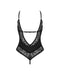Schwarzer, rundum elastischer Stringbody ouvert Bellastia von Obsessive aus super weicher Floralspitze mit blickdichten Details. Kleines Schmuckelement zwischen den Bügel-Cups. Im Rücken großzügiger V-Ausschnitt und verstellbarer Stretchriemen mit Hakenverschluss. Auch die Träger sind passend verstellbar, genauso wie die beiden Stringriemchen im offenen Schritt.
