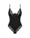 Schwarzer Body Bellastia von Obsessive aus weichem Stretchmaterial mit schönen Spitzen-Details. Kleines Schmuckelement zwischen den Bügel-Cups. Im Rücken tiefer V-Ausschnitt und verstellbarer Hakenverschluss. Auch die hinten mit Spitze verzierten Träger sind passend verstellbar. Genauso wie der Hakenverschluss im Schritt.