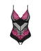 Stringbody ouvert Rosenty von Obsessive in vorteilhafter knapper Schnittführung. Weiches schwarzes Netz und feine pinkfarbene Rosenspitze im stylischen Mix mit blickdichtem schwarzem Stretchmaterial. Mit kleinem Schmuckelement zwischen den Bügel-Cups. Im tiefen Rückenausschnitt mit verstellbarem Hakenverschluss. Auch die Träger sind passend verstellbar. Der Schritt mit zwei Stringriemchen ist verführerisch offen.