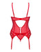 Straps-Corsage und String im roten Set Ingridia von Obsessive. Straps-Corsage aus weicher elastischer Spitze und feinem Stretchtüll. Gepolsterte Bügel-Cups heben und stützen den Busen. Hinten mit Schnürung, die passend verstellbar ist. Genauso wie die Träger und der Hakenverschluss im tiefen Rückenausschnitt. Auch die Strumpfhalter sind passend verstellbar. Der String ist komplett aus weichem Stretchtüll gefertigt.