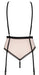 Stringbody Lilines von Obsessive aus roséfarbener weicher Spitze mit eingearbeitetem Strapsgurt aus zartem Powernet. Akzentuiert mit schwarzen Kontrastdetails und schönem Schmuckelement im tiefen Dekolleté. Nahezu rückenfrei. Weich und elastisch für hohen Tragekomfort. Die Träger und Strumpfhalter sind passend verstellbar.